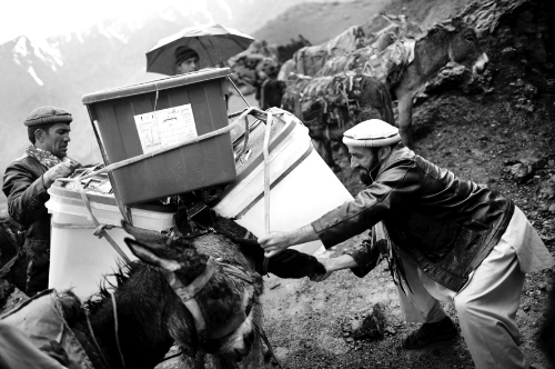 在阿富汗山区,人们用毛驴运送选票箱。 |