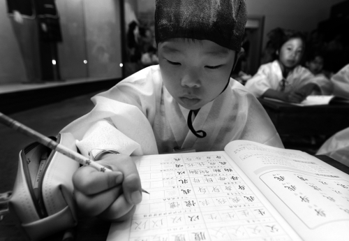 首尔教育史料馆为放暑假的孩子们举办讲座和培训班。图为孩子们在图书馆里穿着传统服装参加汉字讲座,学写汉字。图片来源CFP |