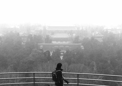 2014年2月26日,北京当天官方PM2.5数值是501,图为一名游客站在景山公园山顶俯瞰北京城。 |