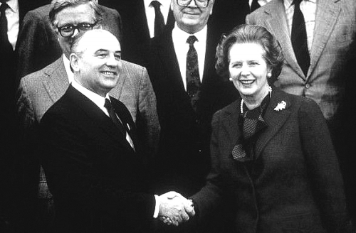 1988年,时任英国首相撒切尔夫人和戈尔巴乔夫握手。 |