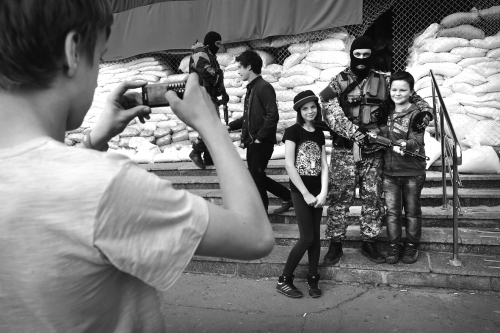 4月21日,斯拉维扬斯克市政府大楼外,孩子们与亲俄武装分子合影。最近几周,乌克兰东部数座城市的政府大楼被亲俄武装分子控制。□图片来源 CFP |