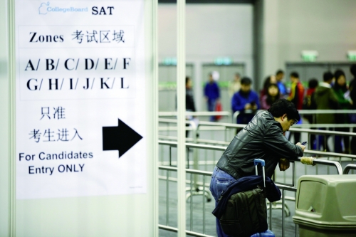 2014年1月25日,近万民中国考生在香港亚洲国际博览馆参加了SAT考试,图为考生家长在考场门口等候。□图片来源 CFP |