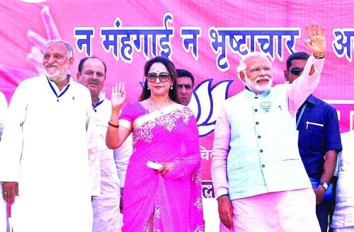 4月21日,印度北部城市马图拉,印度大选正如火如荼地进行,各党派候选人及其支持者纷纷拉票。图为候选人、人民党领袖莫迪(右)和宝莱坞女演员马里尼(中)在竞选集会上拉票。