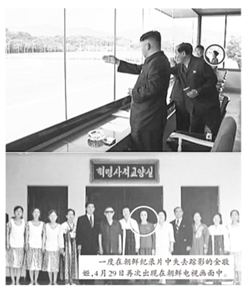 4月29日,金正恩的姑姑、劳动党中央书记局书记金敬姬再度现身朝鲜电视台的节目中。当天下午,电视台播放了金正恩参加体育活动的纪录片,片中两次出现了金敬姬的身影。