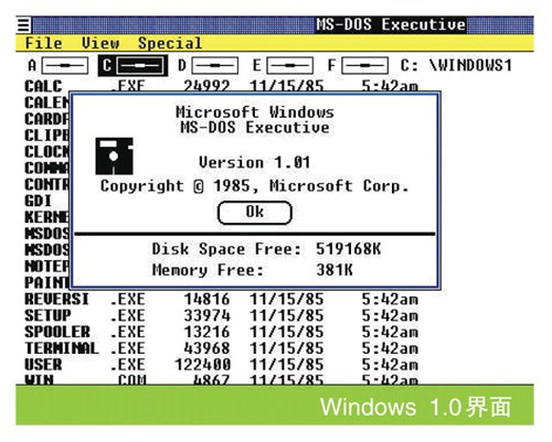 第一代Windows系统被简单命名为Windows 1.0,并在1985年11月20日发布,而当时,比尔·盖茨想以“界面管理器”为名销售它。原因也很简单,这个新的操作系统更像是一个允许用户管理文件的界面。当然,它仍建立在MS-DOS操作系统上,只不过进行了一些新的改进。