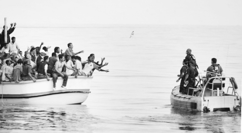 马耳他士兵向被截获的偷渡者扔饮用水 |