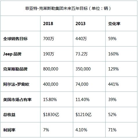 菲-克集团公布的信息显示,该集团期望在未来五年内,将旗下几大品牌销量翻倍,尤其是阿尔法·罗密欧,增速预计超过四倍,JEEP和克莱斯勒的增长率也将达到120%以上。该集团还表示,要将其在美国市场份额从2013年的11.4%,提升至2018年的15.8%。历史上,克莱斯勒在美国市场只有两次超过这一数值。