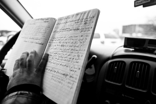 每周6天,每天12小时,阿洛玛驾驶着他那辆闪亮的蓝色道奇出租车,在城市西北部的奥黑尔国际机场周围的几个区域拉活儿。停车等客期间,他时常掏出笔记本写写画画。