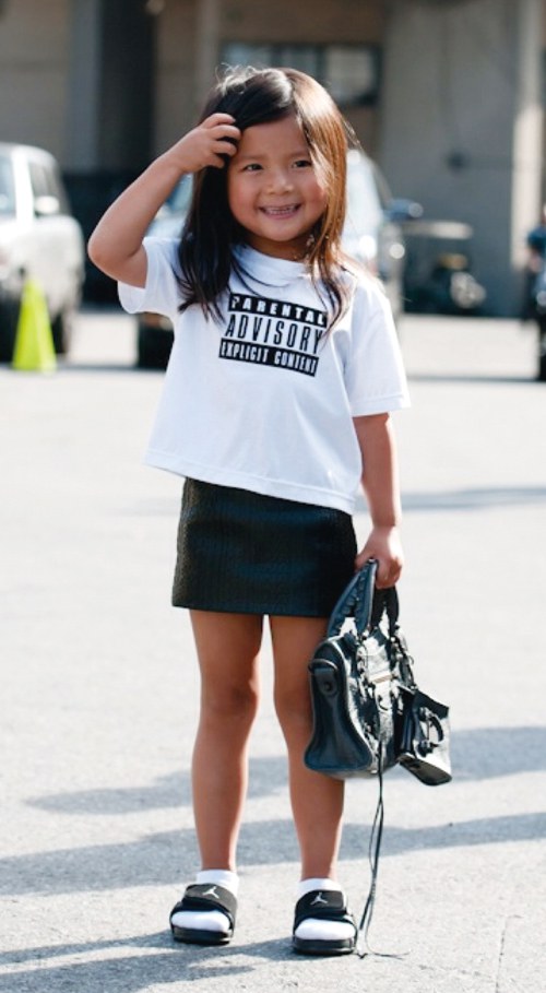 每次现身时装周,这位迷你版的时尚Icon都能迅速引来媒体注目——与同龄的孩子不同,艾莉亚的衣柜里没有梦幻的粉红色,黑与灰才是她的“招牌”;公主雪纺裙也不会出现在她的服装清单上,个性的皮革才是她的“战袍”;她更不会踩着糖果色的娃娃鞋出门,硬派的靴子和球鞋才是她的做风。