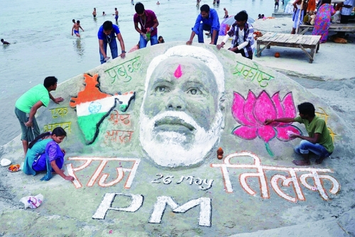 5月26日,印度阿拉哈巴德,当地大学生制作莫迪沙雕,庆祝莫迪就任印度总理。 26日晚,新当选总理、印度人民党领导人纳伦德拉·莫迪在新德里宣誓就职,同时,印度新一届内阁成员也集体亮相。这标志着由印人党领导的新政府正式成立,印度政治进入“莫迪时代”。 本届新内阁是自印度独立以来规模最小的一届,包括莫迪本人在内,成员共45人,比上一届削减了30%。分析人士认为,曾连续3届担任古吉拉特邦首席部长的莫迪,对印度联邦与地方政府的关系有独特理解,推出这样一个“小内阁”,很可能意味着印度新政府在国家治理方面将出现新的重大变化。 |