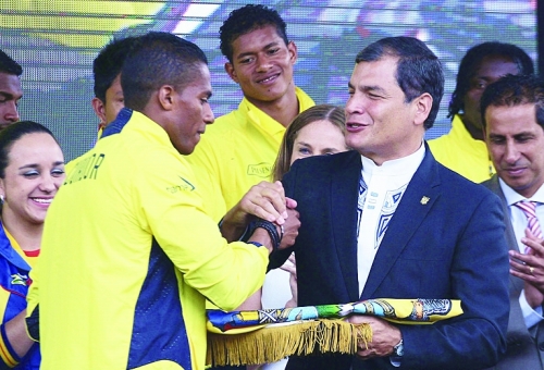 5月26日,厄瓜多尔首都基多,2014世界杯前夕,厄瓜多尔国家足球队举行出征仪式,总统科雷亚为球队壮行。 科雷亚总统感谢国家队在世界杯预选赛上不畏强手,最终闯进决赛圈,给国家和人民带来了巨大的“荣誉和快乐”。他呼吁球员在全世界面前表现出厄瓜多尔人顽强勇敢的精神,还说“让同在E组的对手——瑞士队、法国队和洪都拉斯队,都感到害怕吧!” 厄瓜多尔队将于5月28日前往美国,在那里与墨西哥队和英格兰队各进行一场热身赛。6月15日,厄队将与瑞士队在巴西利亚进行E组的首场比赛。 |