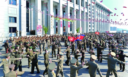 2014年3月9日,朝鲜平壤,干部领导们在第13届最高人民会议代议员选举上投票后跳起舞蹈。 |