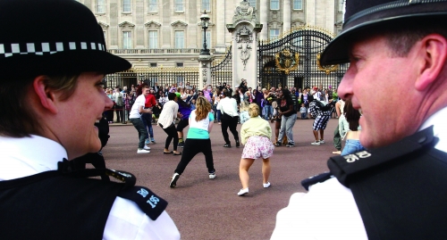 2011年5月9日,英国伦敦,一群大学生在白金汉宫外集体起舞,两名警察见状相觑而笑。 |