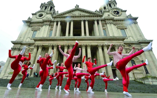 2014年1月23日,英国伦敦,人们在圣保罗大教堂外跳有氧操,为收容所募资活动宣传。 |