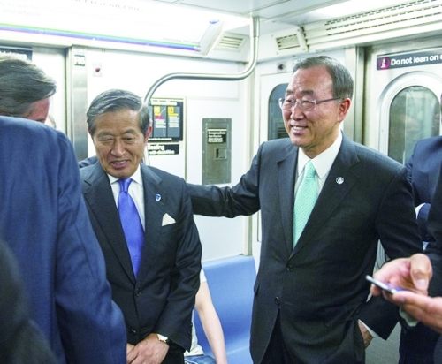 当地时间6月2日,美国纽约,联合国秘书长潘基文乘坐地铁出行,前往会晤纽约市长白思豪。