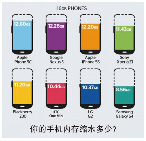 《Which?》杂志的测评显示,索尼XperiaZ1、黑莓Z30、HTC One Min和LG G2等16G热门智能手机,可用内存分别为10~12GB不等,iPhone 5C和5S的16G版则分别为12.6G和12.28G。