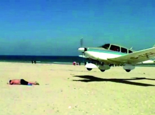 在沙滩上享受日光浴本是件悠闲乐事,但德国一名男子日前在沙滩上日光浴时,却意外遭到一架小型飞机的“袭击”,让旁观者惊出一身冷汗。