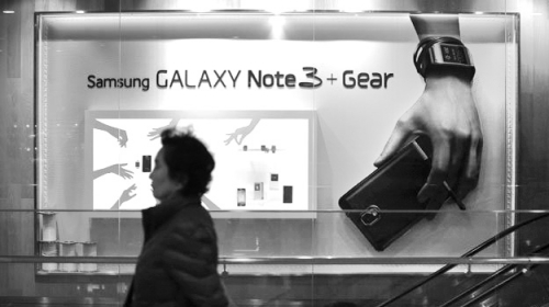 韩国街头,行人走过三星手机的广告牌。经济高速发展,一些老年人的生活却难以为继。 |