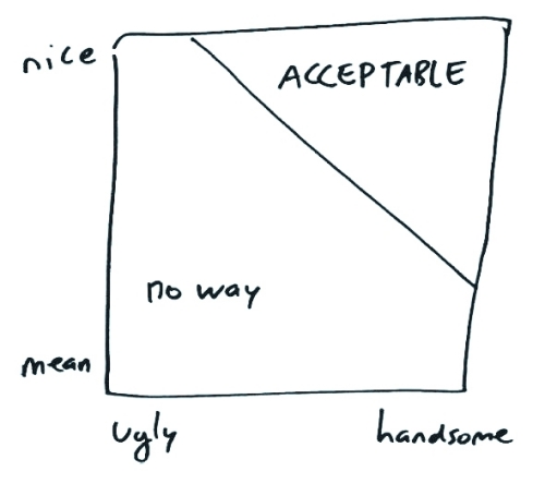 这种现象的根源已经很明确了。三角形中代表帅哥的线从左至右开始挪动,代表他们的性格从好到坏的变化。三角形中你喜欢的丑男们性格都很好,这是必须的,否则你就“看不到”他们了。