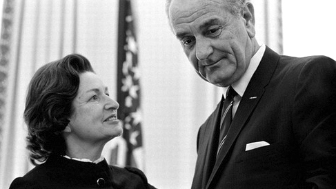 1968年7月26日,美国前总统林登-约翰逊和伯德-约翰逊夫人在白宫椭圆形办公室出席内务部拨款法案仪式。 |