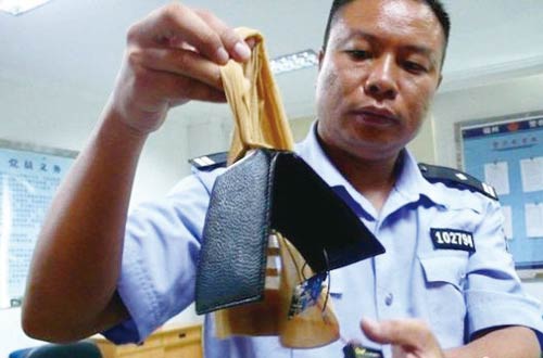 作弊钱包 在广东福州,警察在一名男生身上,发现了这个暗藏玄机的钱包。钱包与一个饮料瓶配合使用。瓶上有供拍摄的小孔,瓶盖内则装有整套摄像系统。另有一个微型接收器,安置在男生的腋下。 |
