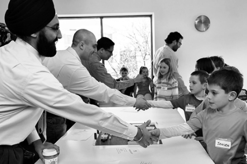 9岁的伯格曼和“老虎实验室”的董事握手 |