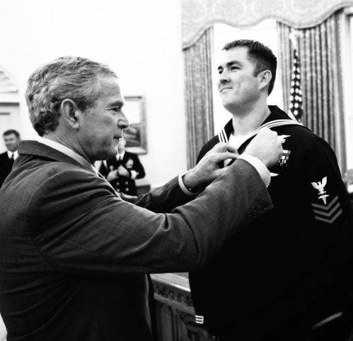 马库斯·鲁特瑞尔伤愈后,时任美国总统小布什为他授勋。 |