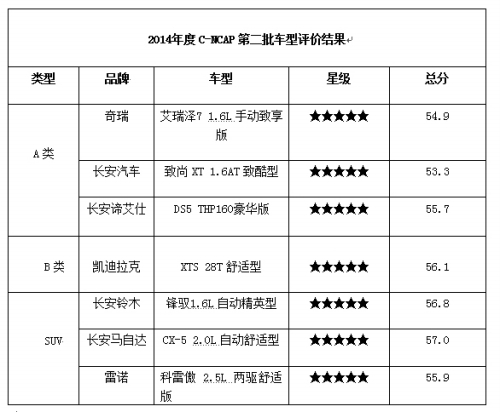 7月1日,中国汽车技术研究中心发布了2014年度C-NCAP第二批车型评价结果。本次发布的结果共涉及7个车型,其中包括3个A类车、1个B类车、3个SUV车型。