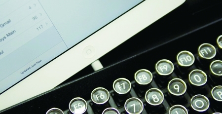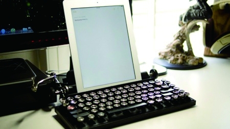 轻薄的数字键盘,一点都没有敲击物理键盘时那种清脆的声音与有力的反馈,尤其是在平板设备上。这款复古打字机键盘正好能满足追求质感与触感的极客们。精致的铜皮按键、做旧处理的漆皮与字母、逼真的换行支杆,与历史有关的场景尽在眼前。