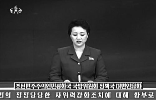 朝鲜电视台播音员播报国防委员会政策局发言人的讲话,称朝鲜的战术火箭和炮击训练正当合法。 |