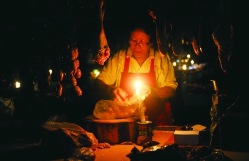 7月17日,菲律宾马尼拉的小贩点着蜡烛卖肉。“威马逊”一度致该国大部分电力供应中断,民众摸黑过日子。 |