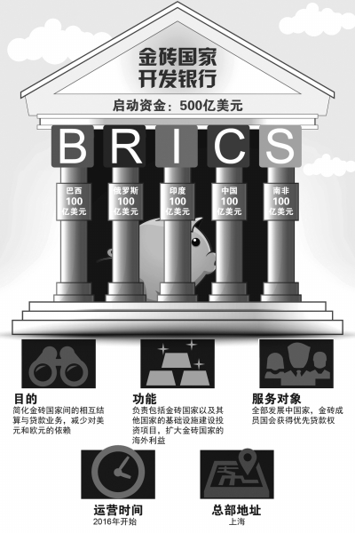 7月15日,在金砖国家峰会期间,“金砖五国”——中国、巴西、俄罗斯、印度和南非协商决定,成立金砖国家开发银行和应急储备基金。