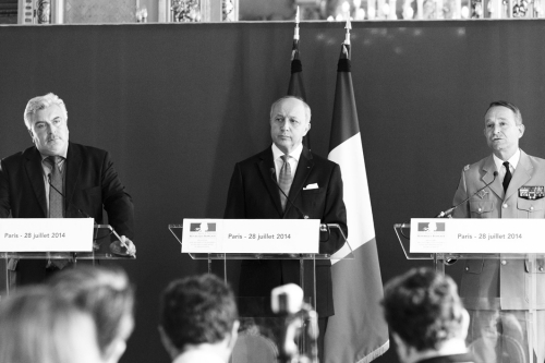 7月28日,法国巴黎,法国政府就阿航AH5017召开新闻发布会,外长法比尤斯(中)称,调查表明,飞行员曾在失联前要求折返。 |