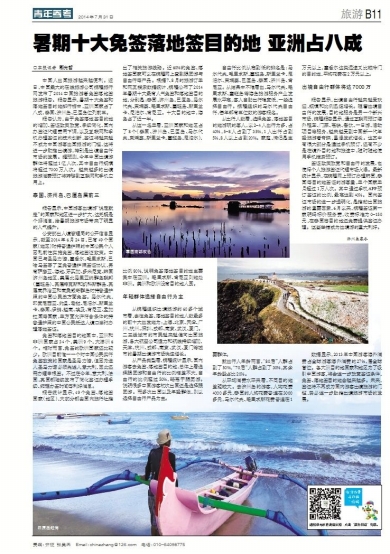 中国人出国旅游越来越便利。近日,中国最大的在线旅游公司携程旅行网发布了2014中国旅游者免签落地签旅游报告。报告显示,暑期十大免签和落地签目的地排行榜中,亚洲国家占了八成,泰国、济州岛、巴厘岛位列前三。