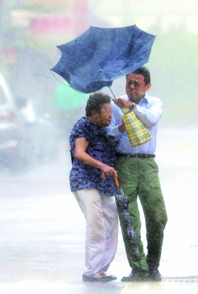 7月23日,台北街头行人的雨伞被强风吹翻。 |