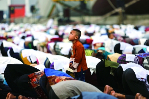 7月28日,印度尼西亚雅加达,一个男孩在开斋节祷告期间抬头看从空中飞过的遥控相机。印尼是世界上穆斯林人口最多的国家;而7月29日是2014年的开斋节。