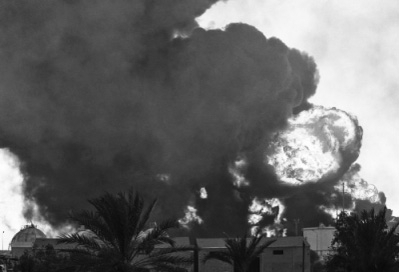 8月3日,意大利“大力神”军用运输机在引擎的轰鸣中,爬升到利比亚首都的黎波里上空。万米高空之上,英国记者克里斯·史蒂芬终于看到了这场城市浩劫的全貌——火箭弹和炮弹在灰暗的城市中飞窜,黑烟从燃烧的油罐里螺旋上升,房屋被点燃成一片火海。如同玩具般大小的汽车逃向城外,载着焦虑的的黎波里居民寻找避难所。