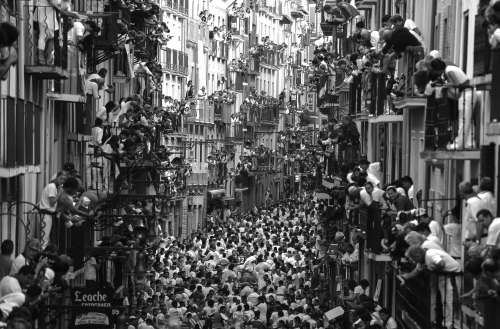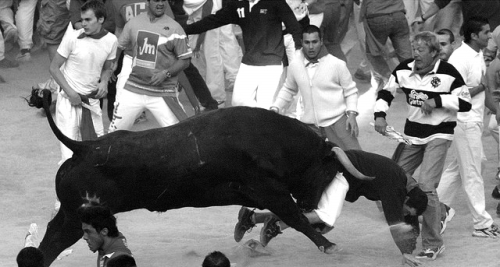 突然之间,一头公牛出现在我的前方。当一头牛离群时,它会丧失畜群本能,把所有的奔跑者当做敌人。这头独牛就是这么干的——它把牛角顶向几十名四散开来的人群。那头凶猛的公牛突然冲向我,我赶忙蹲伏下来,把卷起来的报纸伸到它的视线内——就像吸引公牛注意力的斗牛士斗篷。有那么一会儿,它平静了。我用另一只手示意后面的人,我要后退了。一名穿蓝衬衫的英国人尖叫起来,推开我的手,不愿让路。他的一个朋友抓住隔开奔跑者与人群的栅栏,朝着我的方向尖叫。10年前,我第一次参加奔牛时,就像他们那样害怕。