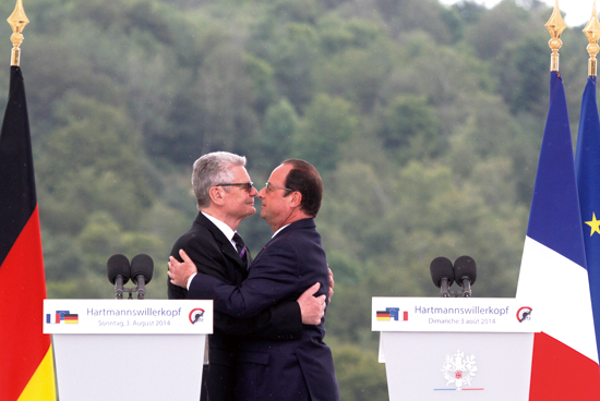 当地时间8月3日,法国总统奥朗德和德国总统高克在纪念一战百年的仪式上讲话后紧紧拥抱,他们当天参加了在上莱茵省哈曼斯维莱霍夫的一战战场旧址上举行的纪念活动。而8月3日,也是德国当年向法国宣战的日子。