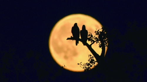2014年8月10日,美国缅因州普雷斯克艾尔,两只秃鹰站在“超级月亮”前的树枝上。 “超级月亮”也被称为“近地月亮”,是指月球运行到轨道上最接近地球的点的同时,正好是满月或者新月。这时的月亮会比平常看上去更大,也就是人们理解的“最大最圆月亮”。 超级月亮通常每年只有一次,但今年会出现5次。它之前已分别于1月1日、1月30日、7月12日现身,9月8日晚将是最后一次,届时月球距离地球35.91万公里。 |