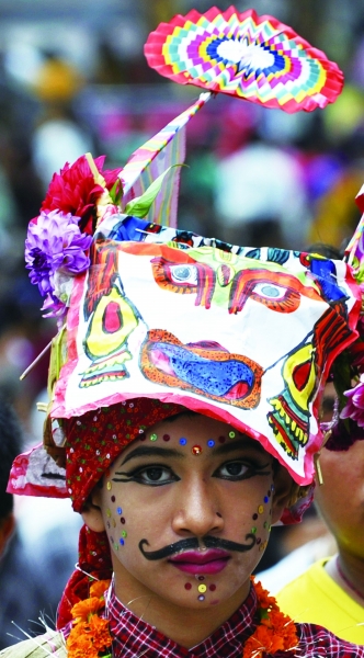 2014年8月11日,尼泊尔迎来一年一度的盛大节日“神牛节”,许多民众扶老携幼前往各地庙宇朝拜。该节日源自尼泊尔马拉王朝,据传当时一位国王丧子,王后悲痛欲绝,为安慰王后,国王下令让当年丧亲的家庭牵牛游行。这一习俗沿袭至今,大多数没有牛的家庭则让男孩装扮成“神牛”,为逝者祈福。图为尼泊尔首都加德满都杜巴广场上一位装扮成“神牛”的男孩前往寺庙朝拜。 |