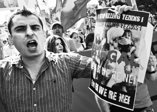 8月9日,雅兹迪派民众及支持者在德国法兰克福集会示威,抗议ISIS在伊拉克的恐怖行径。数以千计的伊拉克雅兹迪派民众因ISIS而受困山区多日。图片来源CFP |