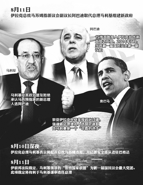 8月14日,伊拉克总理马利基与新当选的达瓦党领导人阿巴迪,并肩出现在电视屏幕中。美国《华盛顿邮报》称,马利基表情呆滞地宣布,他不再寻求连任,而将支持他的“兄弟”阿巴迪组阁,以实现伊拉克的团结。