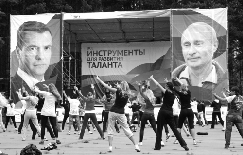 今年Nashi举办的夏令营活动中,该组织成员在悬挂着普京和梅德韦杰夫大幅肖像的舞台下跳健身操。 |