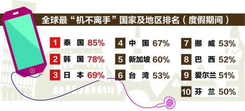 本报讯 近日,酒店预订专家好订网(Hotels.com)就各国游客在度假期间对电子科技产品的使用习惯展开的调查显示:亚洲地区游客是外出旅行时最常使用手机的“低头族”,囊括榜单前五。泰国高居榜首,高达85%的泰国游客表示,无法想象度假时不携带任何移动设备或笔记本电脑出行,分获二、三名的韩国与日本,有78%和69%的受访者承认在度假时依赖电子产品,中国则以67%位列第四。