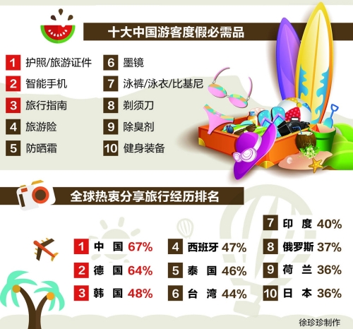 调查揭晓的十大中国游客度假必需品中,智能手机仅次于护照/旅游证件位列第二,足见中国游客在外出度假时对电子产品存在较大的依赖。与此同时,旅行指南、旅游险及防晒霜的排名也较为靠前,被中国游客视为出行必备品;位居榜单最后的是健身装备,说明中国游客在度假期间对运动与健身的需求较为忽视。