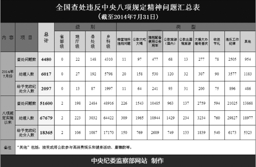 2014年7月,违规配备使用公务用车查出问题数达477件,处理人数530人次,给予处分人数为241人。“八项规定”实施以来的累计数字则分别为10485、10944和2689。