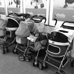 一走进台中市宠物展,不少人就会被高档宠物手推车吸引,这些豪华帆布质地的手推车设计精巧,有结实的大车轮和实用的遮光板。人们可以将狗、猫和兔子等小型动物放在车里,像带宝宝一样,推着宠物出行。