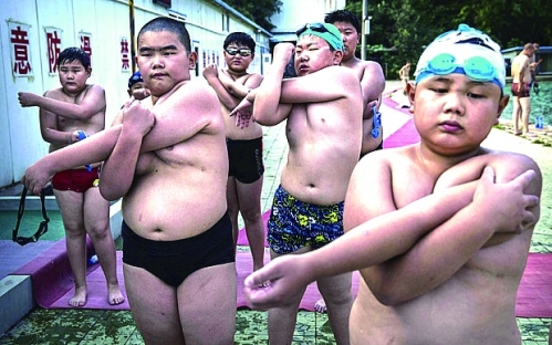 在北京一个儿童减肥训练营中,超重的“小胖”们正在做游泳前的热身运动。 □图片来源 美国有线电视新闻网 |