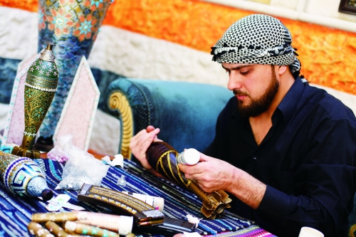 当地时间8月30日,在叙利亚首都大马士革附近的杜马镇,艺术家阿克拉姆·阿布·艾尔-法兹使用传统的叙利亚绘画技巧,在一枚炮弹的弹壳上作画。